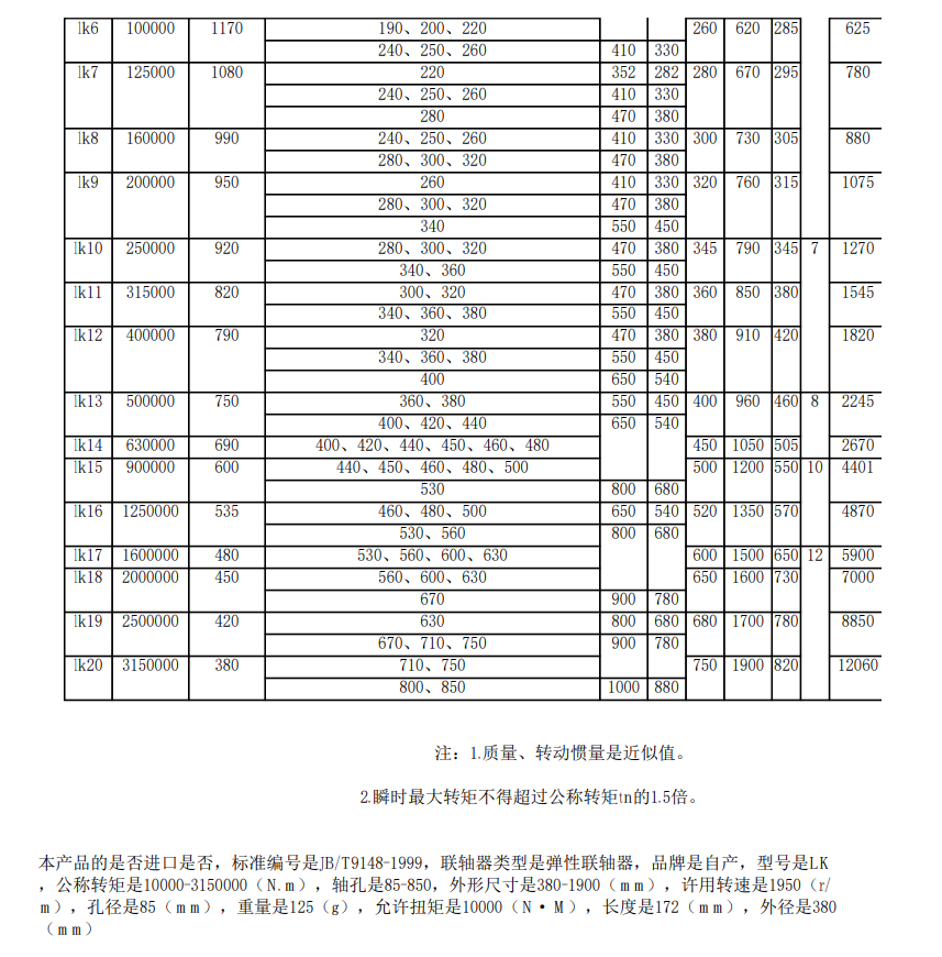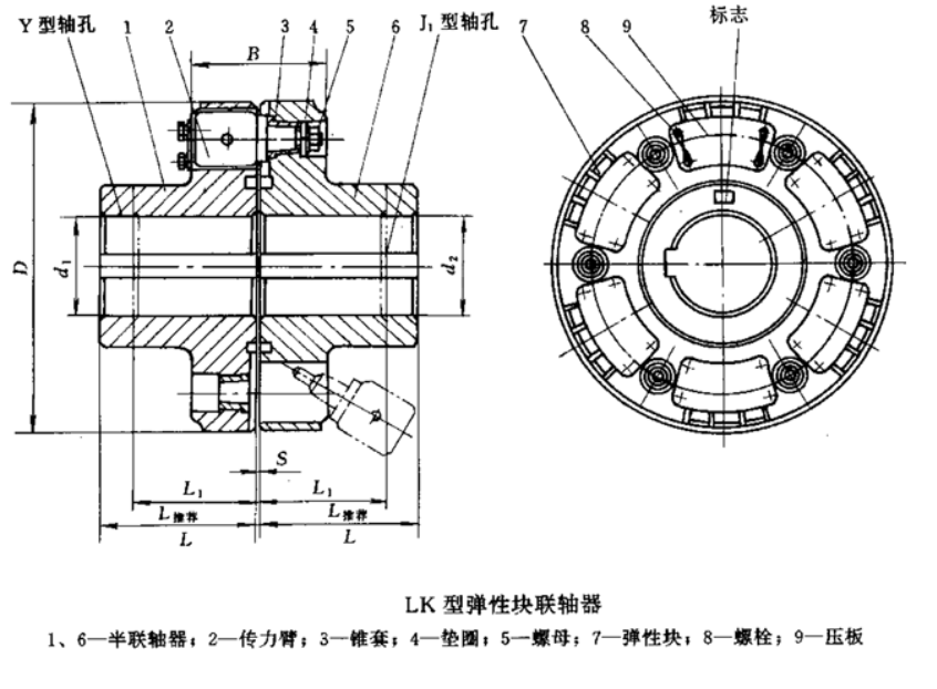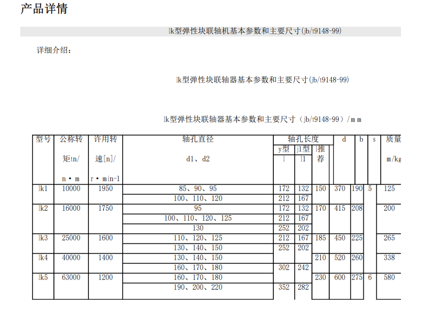LK彈性塊聯(lián)軸器是以橡膠為彈性元件材料,無(wú)扭轉(zhuǎn)傳動(dòng)間隙,易于現(xiàn)場(chǎng)調(diào)節(jié)剛度的彈性聯(lián)軸器,具有補(bǔ)償兩軸相對(duì)偏移以及減振、緩沖性能,節(jié)能,無(wú)噪聲,不用潤(rùn)滑,更換彈性件(易損件)時(shí)主機(jī)半聯(lián)軸器用作軸線(xiàn)移動(dòng)(對(duì)于重型機(jī)械設(shè)備此特點(diǎn)尤為重要)。 安裝維護(hù)簡(jiǎn)便,使用壽命較長(zhǎng),根據(jù)需要通過(guò)改變橡膠配方(主要改變硬度)可以調(diào)整聯(lián)軸器的扭轉(zhuǎn)剛度。適用于聯(lián)接兩同軸線(xiàn)大中功率、振動(dòng)沖擊較大的軸系傳動(dòng),例如冶金機(jī)械、礦山機(jī)械等。原來(lái)的標(biāo)準(zhǔn)(ZBJ19029-90)存在外徑尺寸大、質(zhì)量大等缺點(diǎn),改進(jìn)后的新標(biāo)準(zhǔn)(JB/T9148-99代替ZBJ19029-90)新結(jié)構(gòu)不僅保留了減振、緩沖性能好的特點(diǎn),而且縮小了外徑尺寸,減輕了質(zhì)量和轉(zhuǎn)動(dòng)慣量,提高了許用轉(zhuǎn)速,經(jīng)過(guò)幾年的工業(yè)應(yīng)用,優(yōu)點(diǎn)十分明顯,已成原結(jié)構(gòu)的更新?lián)Q代產(chǎn)品。新標(biāo)準(zhǔn)許用轉(zhuǎn)速平均提高28%,**外徑平均縮小36%,轉(zhuǎn)動(dòng)慣量平均減小70%,質(zhì)量平均減輕57%。